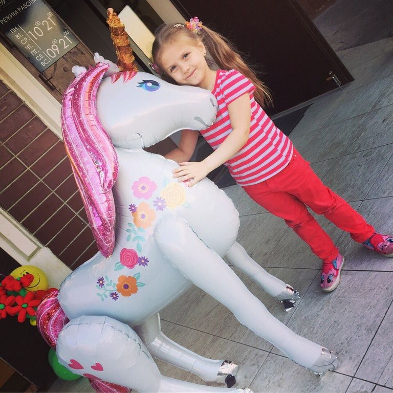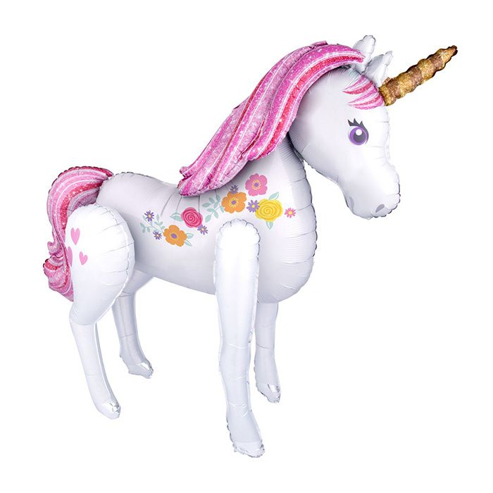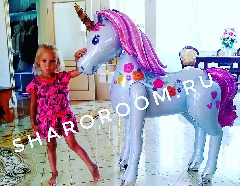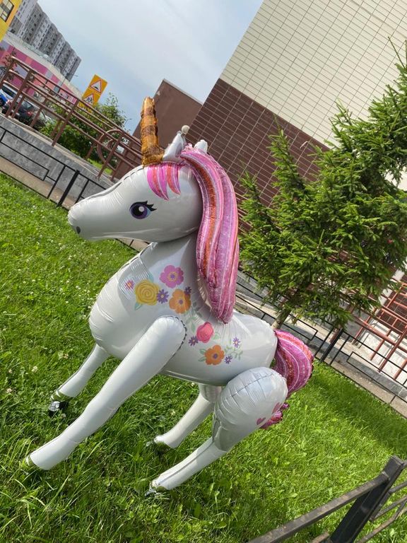 Волшебный единорог - большая ходячая фигура высотой 116 см и длиной 106 см, станет эффектным подарком или отличным фоном для фотосессии. Фигура выполнена из миларовойпленки, что позволяет ей не сдуваться более недели. Шар не взлетает под потолок благодаря специальным грузикам на "копытах" Единорога.