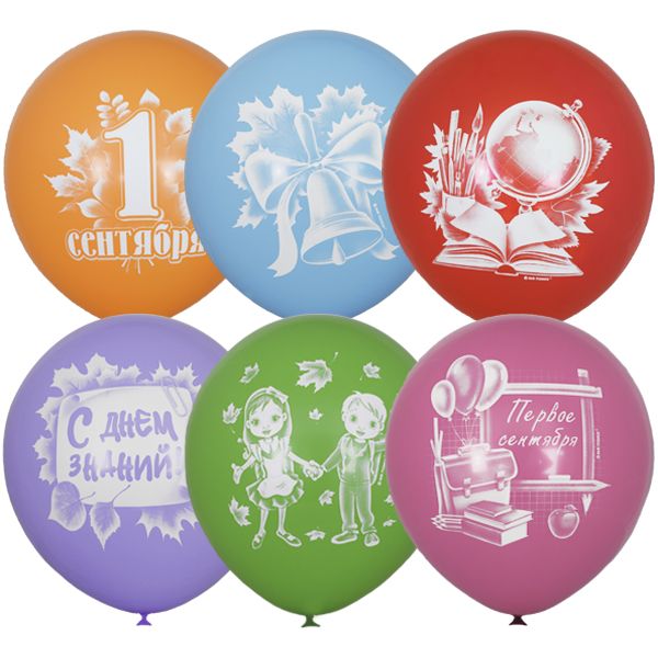 Ассорти воздушных шаров к 1 Сентября. Рисунки выполнены на шарах типа пастель и декоратор. Воздушные шары типа "пастель" характеризуются нежными, пастельными цветами, они непрозрачны и имеют мягкий блик. Воздушные шары типа "декоратор" характеризуются обширной цветовой палитрой и в зависимости от цвета бывают полупрозрачными и матовыми.