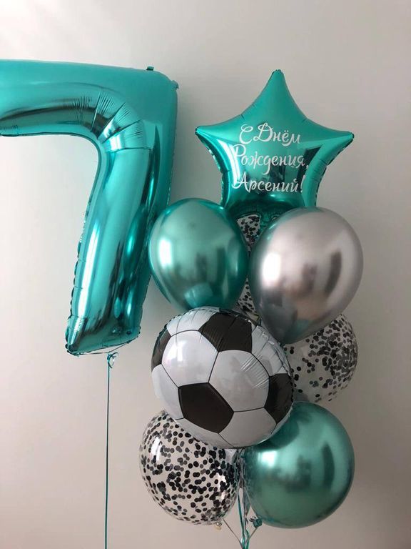 -фонтан (звезда с индивидуальной надписью, круг футбольный мяч, 3 шара с конфетти, 5 шаров хром)