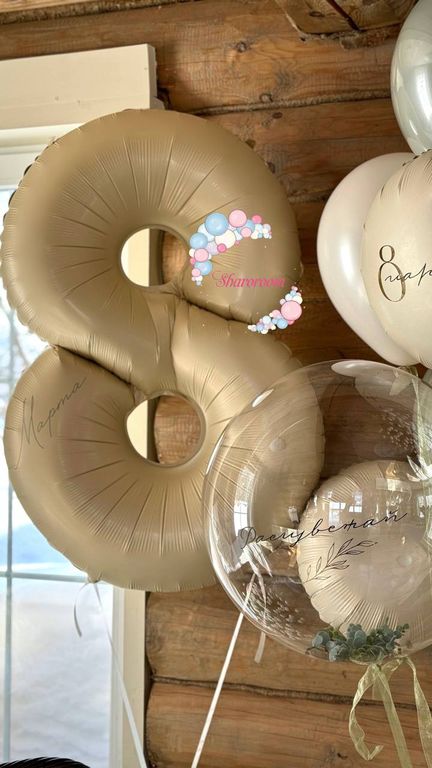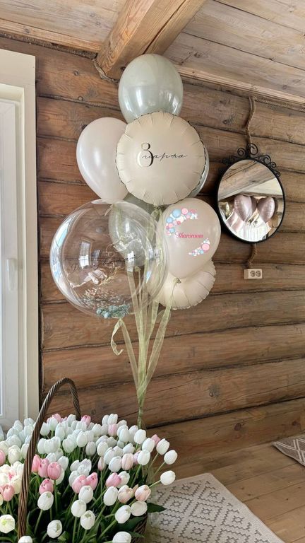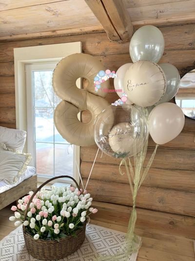 Фонтан (Шар Баблс с искуственным эвкалиптом и надписью, 2 фольгированных круга на одном индивидуальная надпись, 3 шара даблстаф, 2 обычных шара)