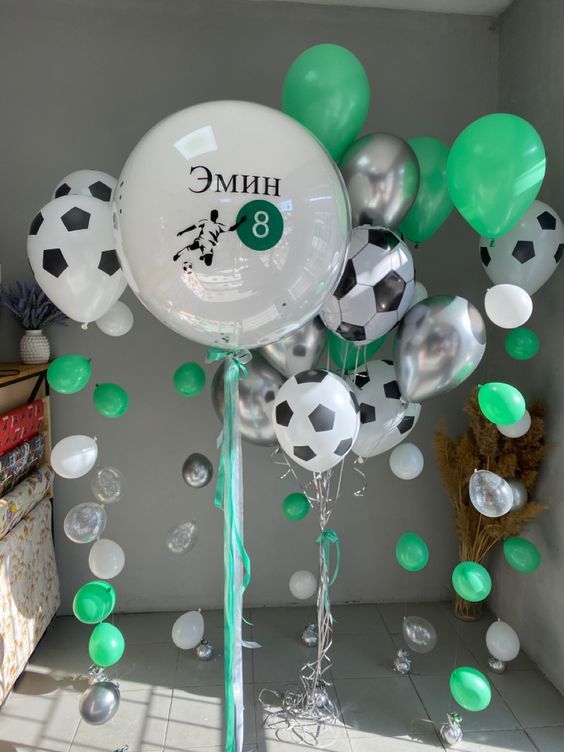 -фонтан из 13 шаров (4 обычных шара, 4 шара хром, 4 шара футбольный мяч, фольгированный круг футбольный мяч)