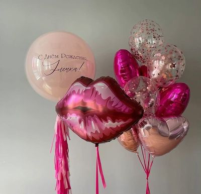 -фонтан из 10 шаров (3 сердца фуксия, 3 сердца розовое золото, 4 шара с конфетти)