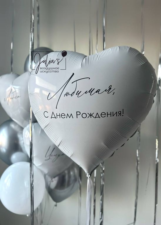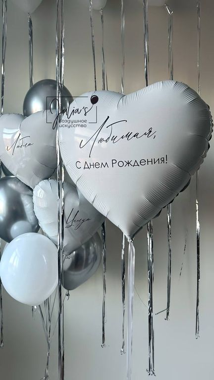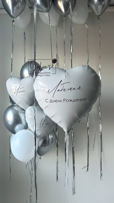 -Фонтан из 10 шаров(2 сердца 45см с индивидуальными надписями, 4 шара хром серебро, 4 обычных шара)