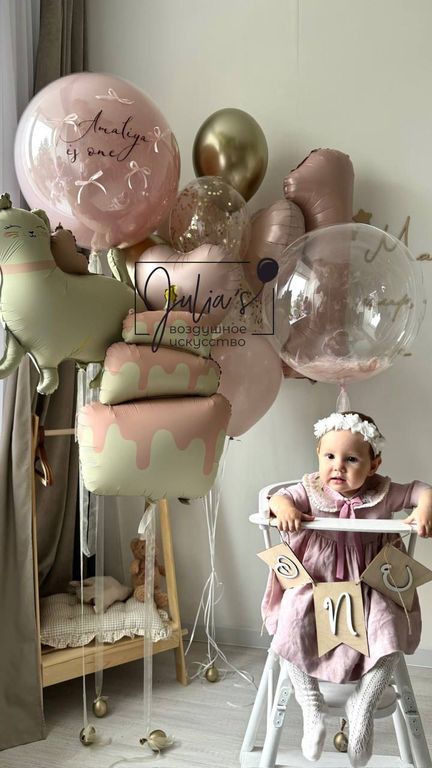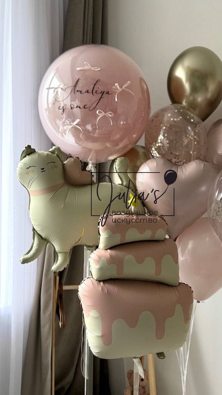 - Фонтан из 8 шаров (2 сердца, 2 шара хром, 2 шара с золотым конфетти и 2 обычных шаров)